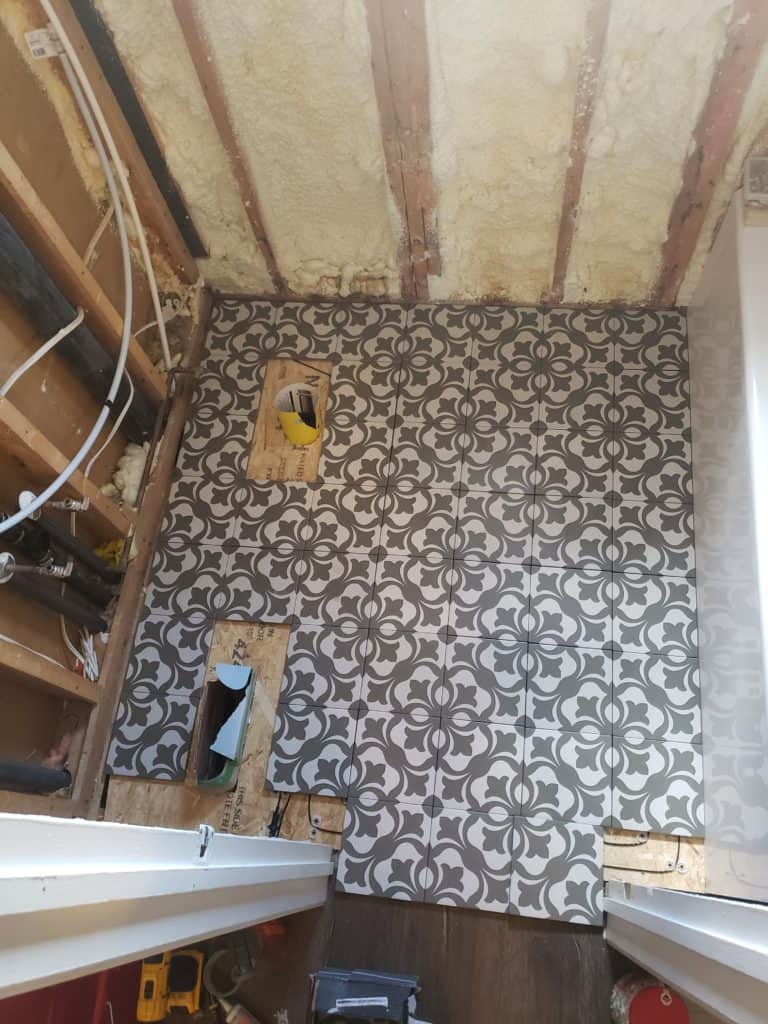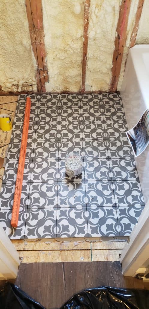Sometimes in the middle of a reno, things come up or happen that can really bring your reno to a screeching halt. Our problem presented itself when we tiled the bathroom floor. In case you’re new here, we are participating in the One Room Challenge and have been renovating our main bathroom.