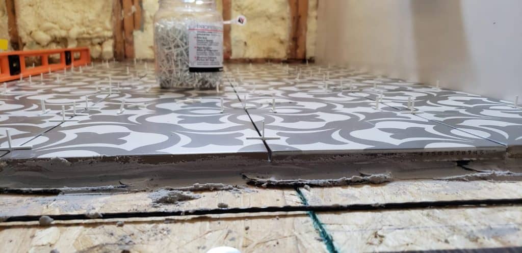 We knew with the wire we would have to add some extra cement on the floor. But what we didn’t expect was how long it would take to dry. The cement jug stated 24 to 72 hours…73 hours later and our tiles were still moving and one actually popped right off…