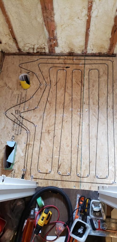 Because it’s a small space, Chris and I decided to treat ourselves a bit and install heated floors. So we purchased a kit at Home Depot and followed the instructions. It was pretty straight forward until we installed the switch which wasn’t very clear as to how to hook it up to the power. That was frustrating but after a quick google search, we figured it out.